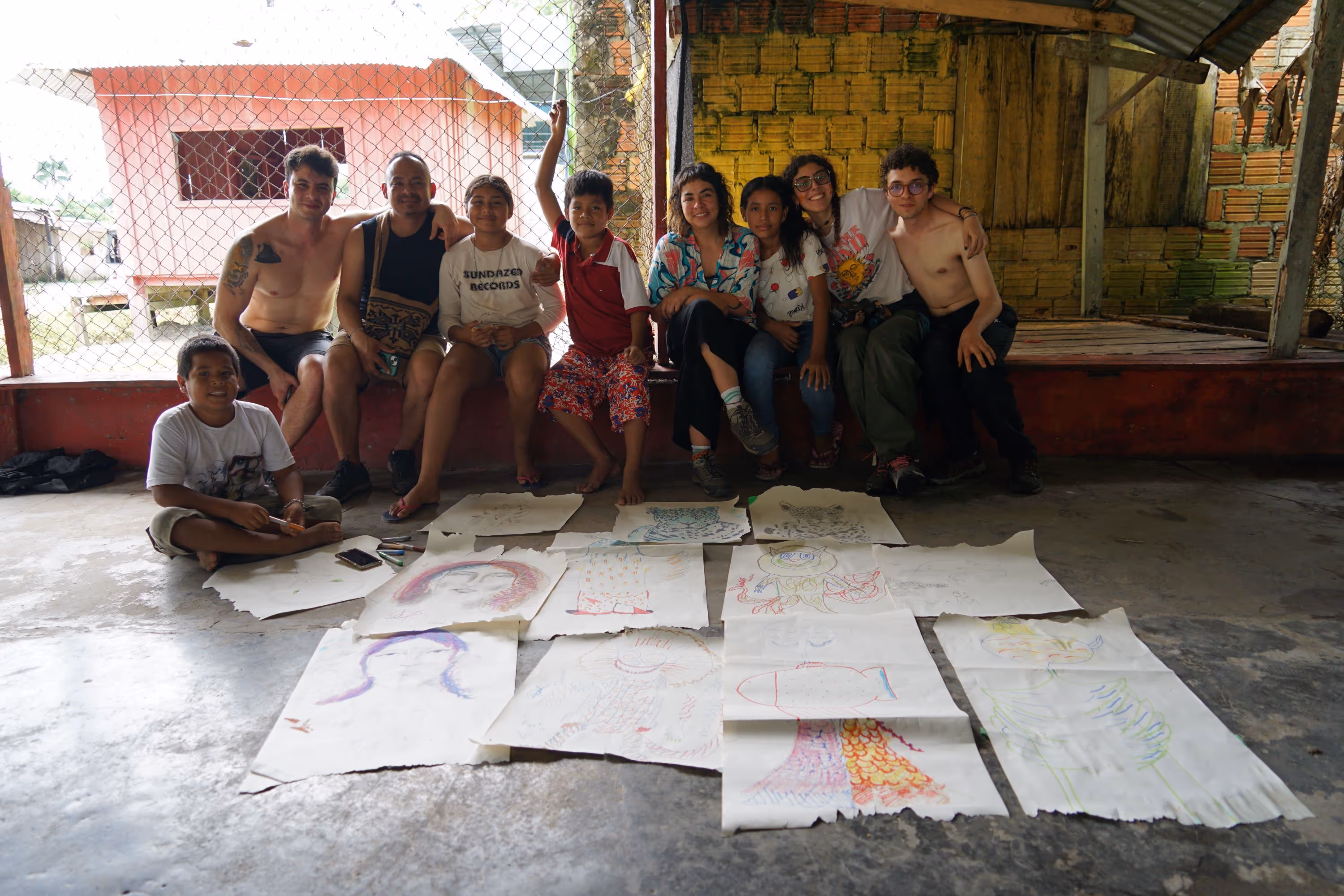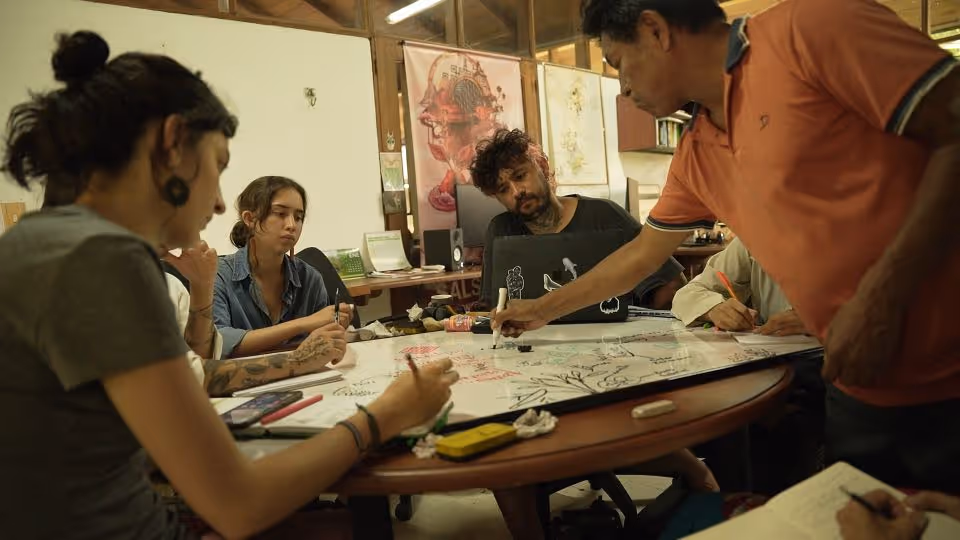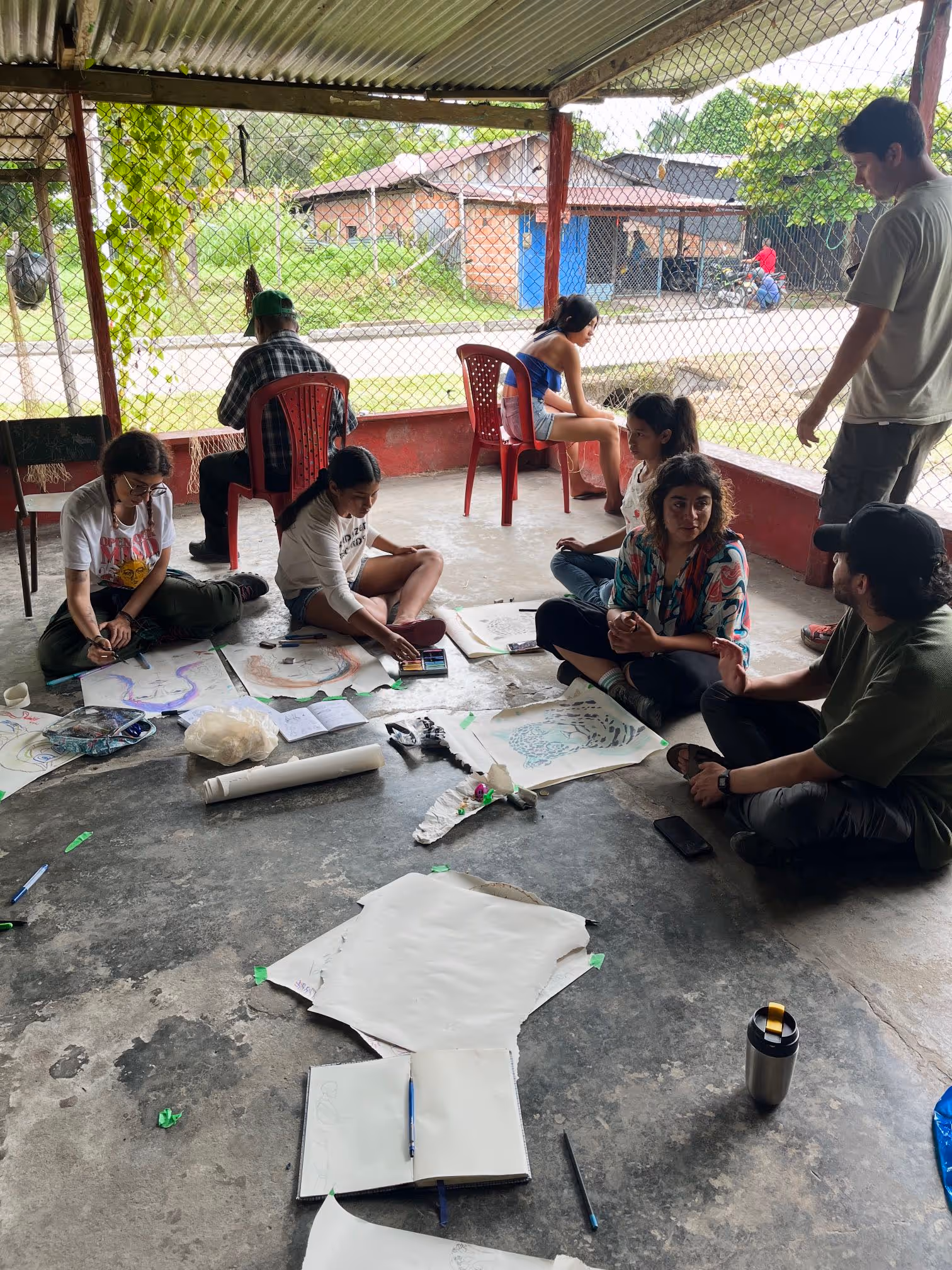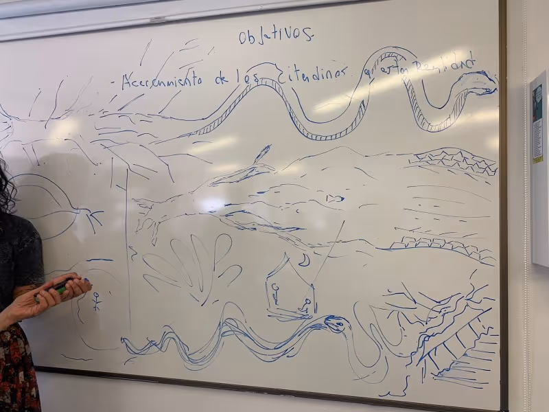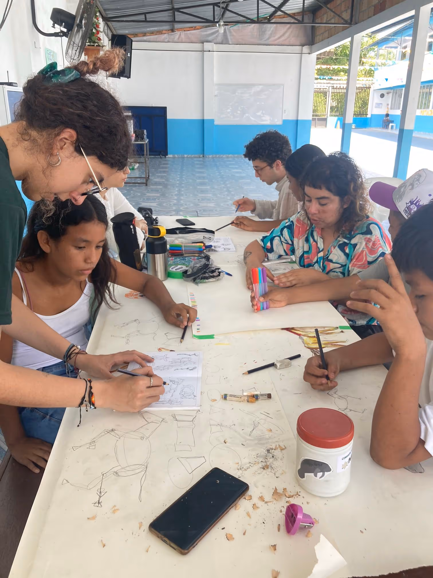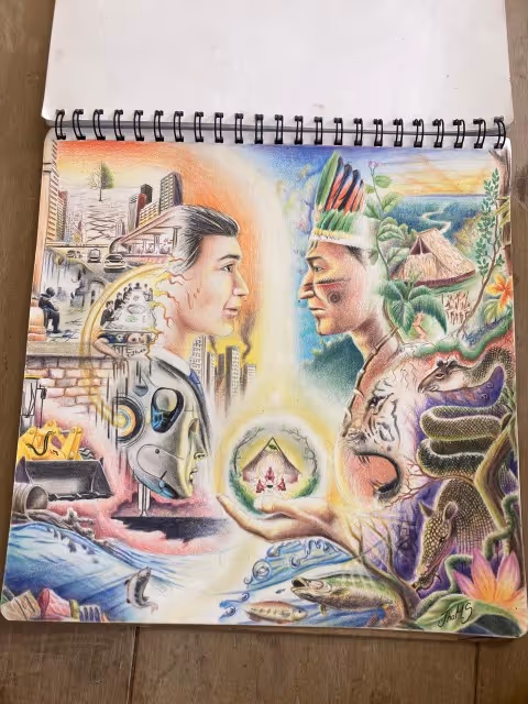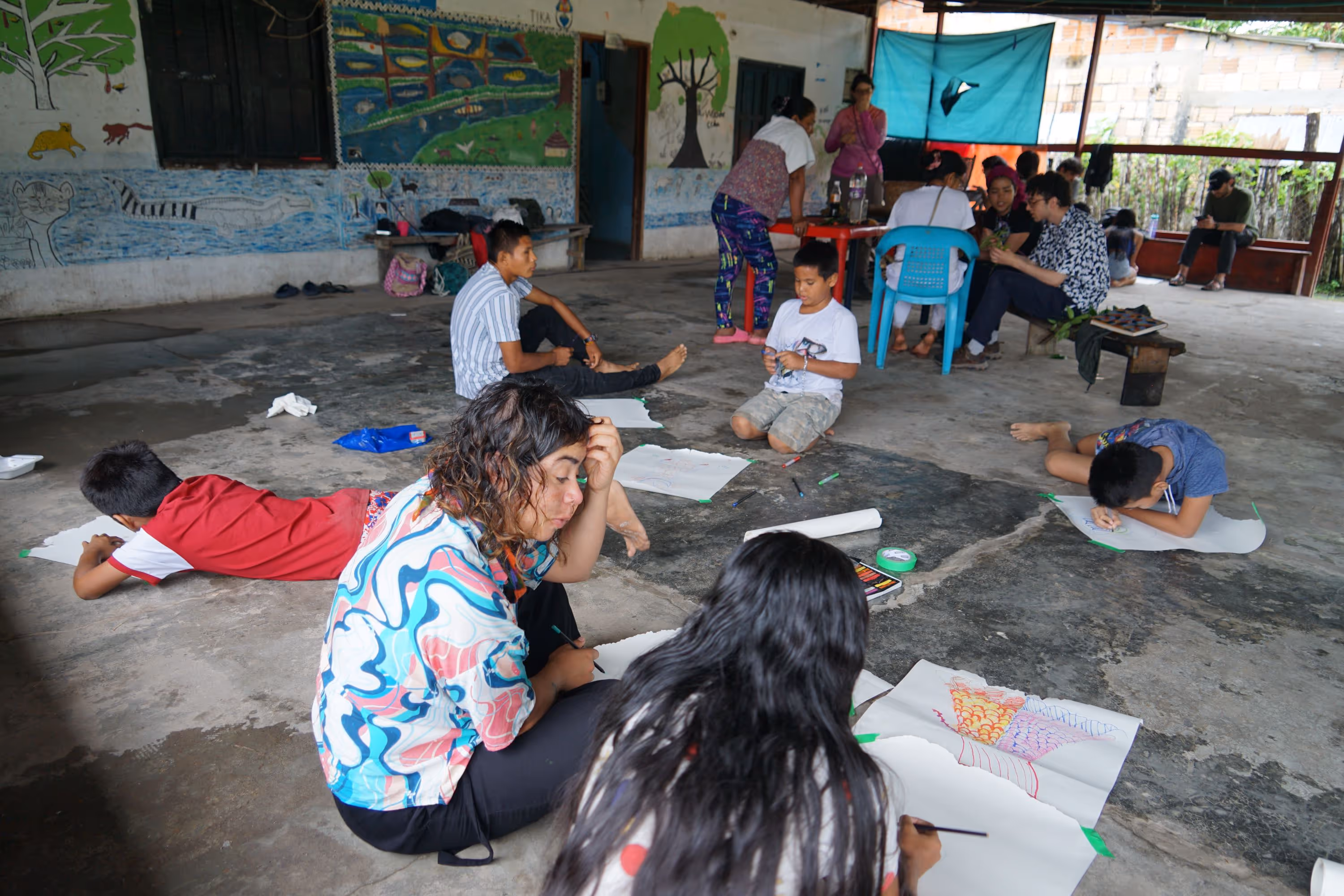 Inicia la bocetación del mural con sesiones de dibujo y planificación colectiva en torno a lo aprendido. Jhonier, artista del Territorio Amazónico, aporta sus bocetos, que dan forma a la estructura general: en el centro las comunidades aisladas y alrededor las cuatro organizaciones que les protegen: AIZA; PANI; AIPEA y CIMTAR.
