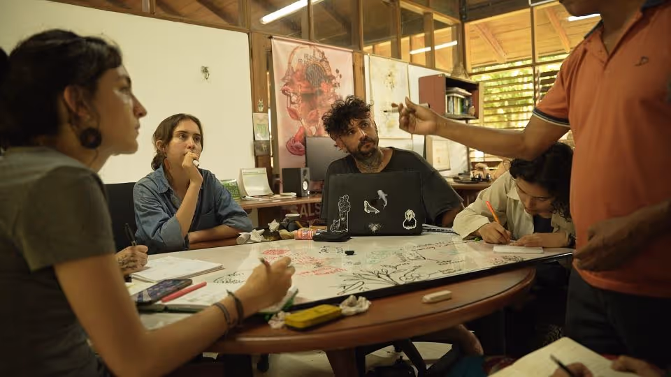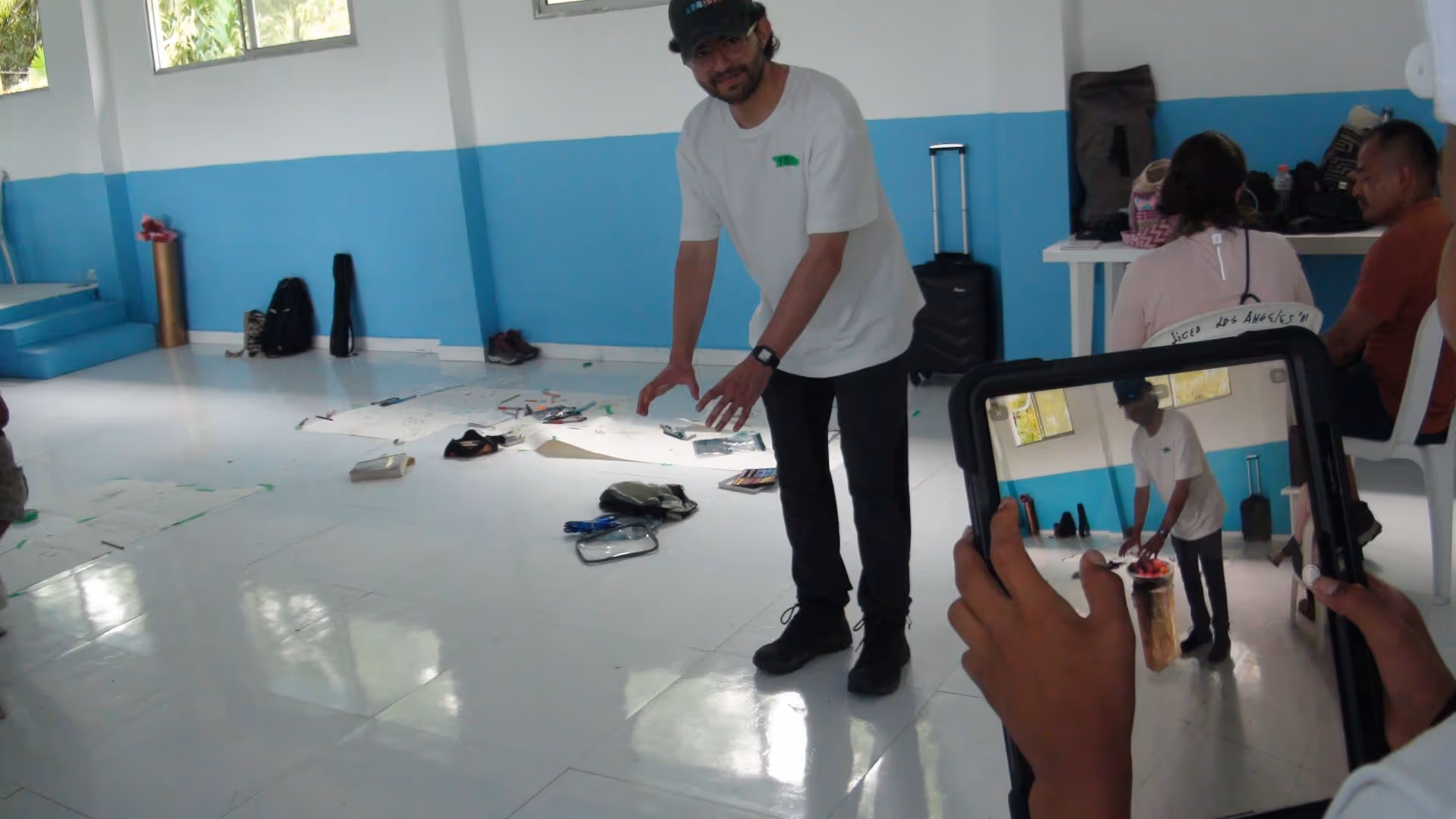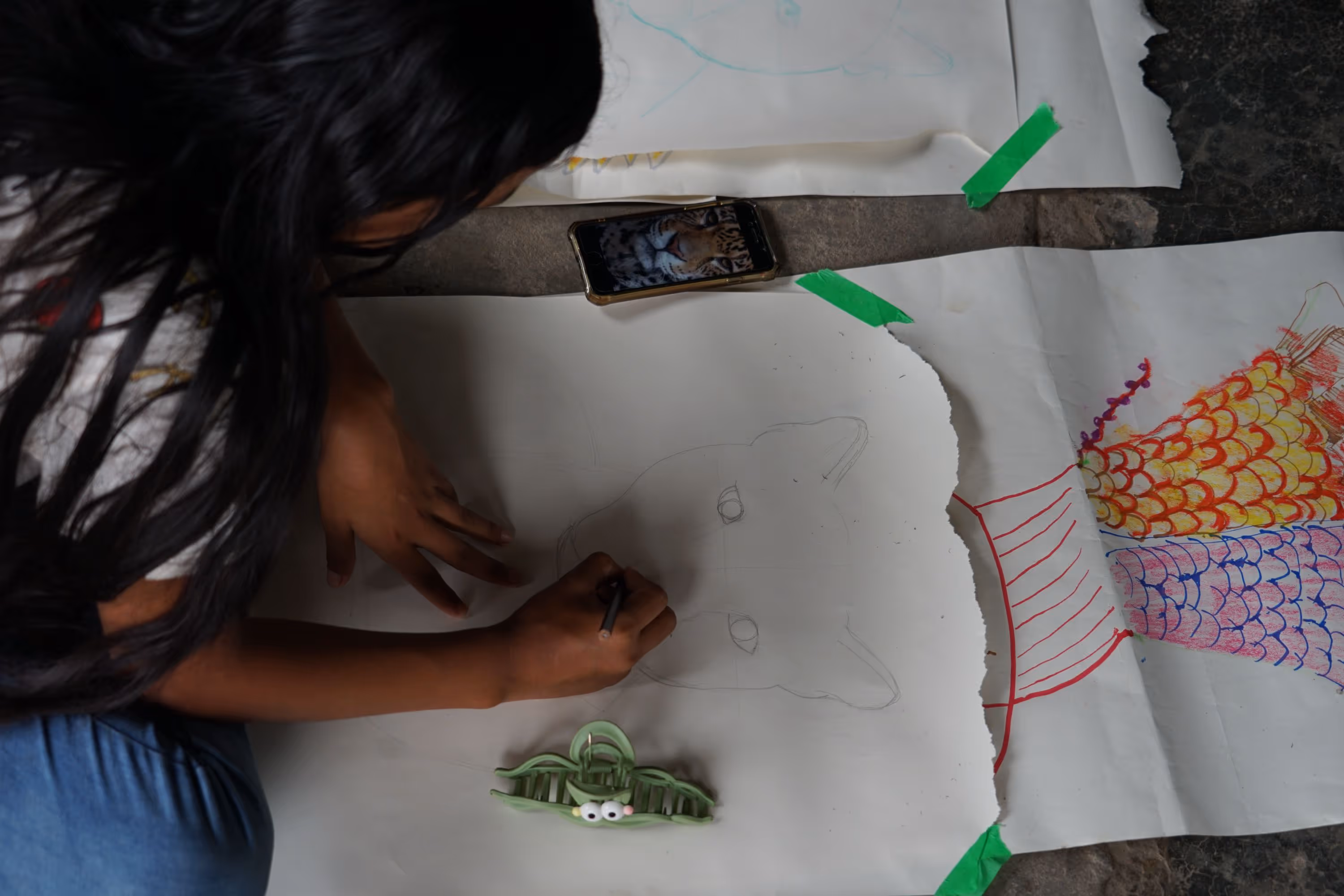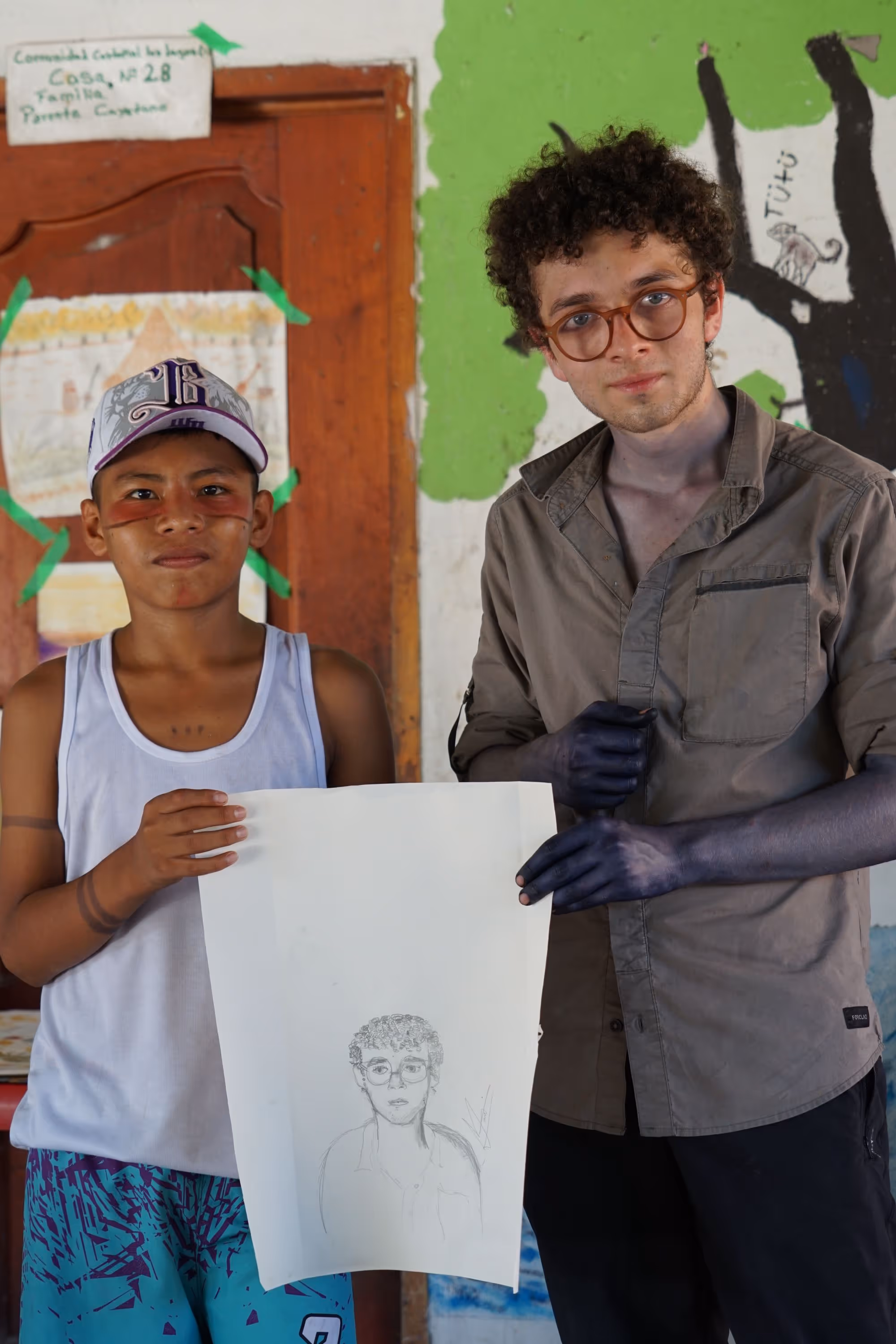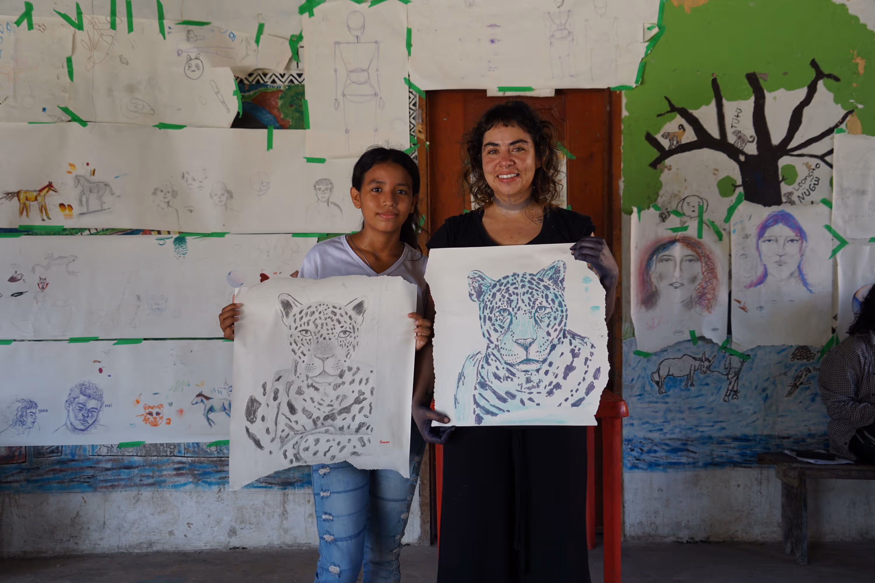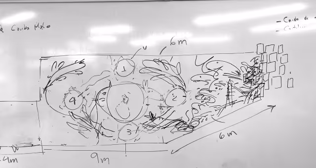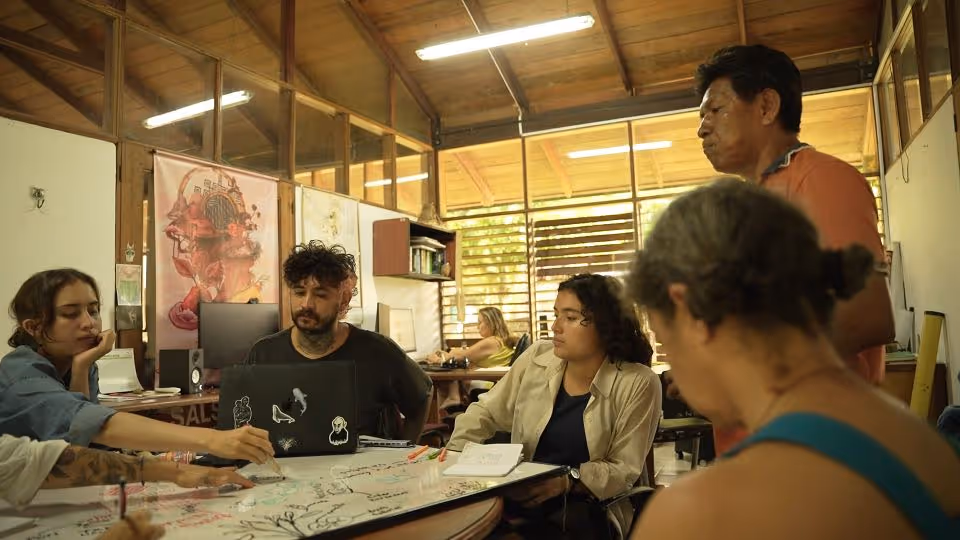 Inicia la bocetación del mural con sesiones de dibujo y planificación colectiva en torno a lo aprendido. Jhonier, artista del Territorio Amazónico, aporta sus bocetos, que dan forma a la estructura general: en el centro las comunidades aisladas y alrededor las cuatro organizaciones que les protegen: AIZA; PANI; AIPEA y CIMTAR.