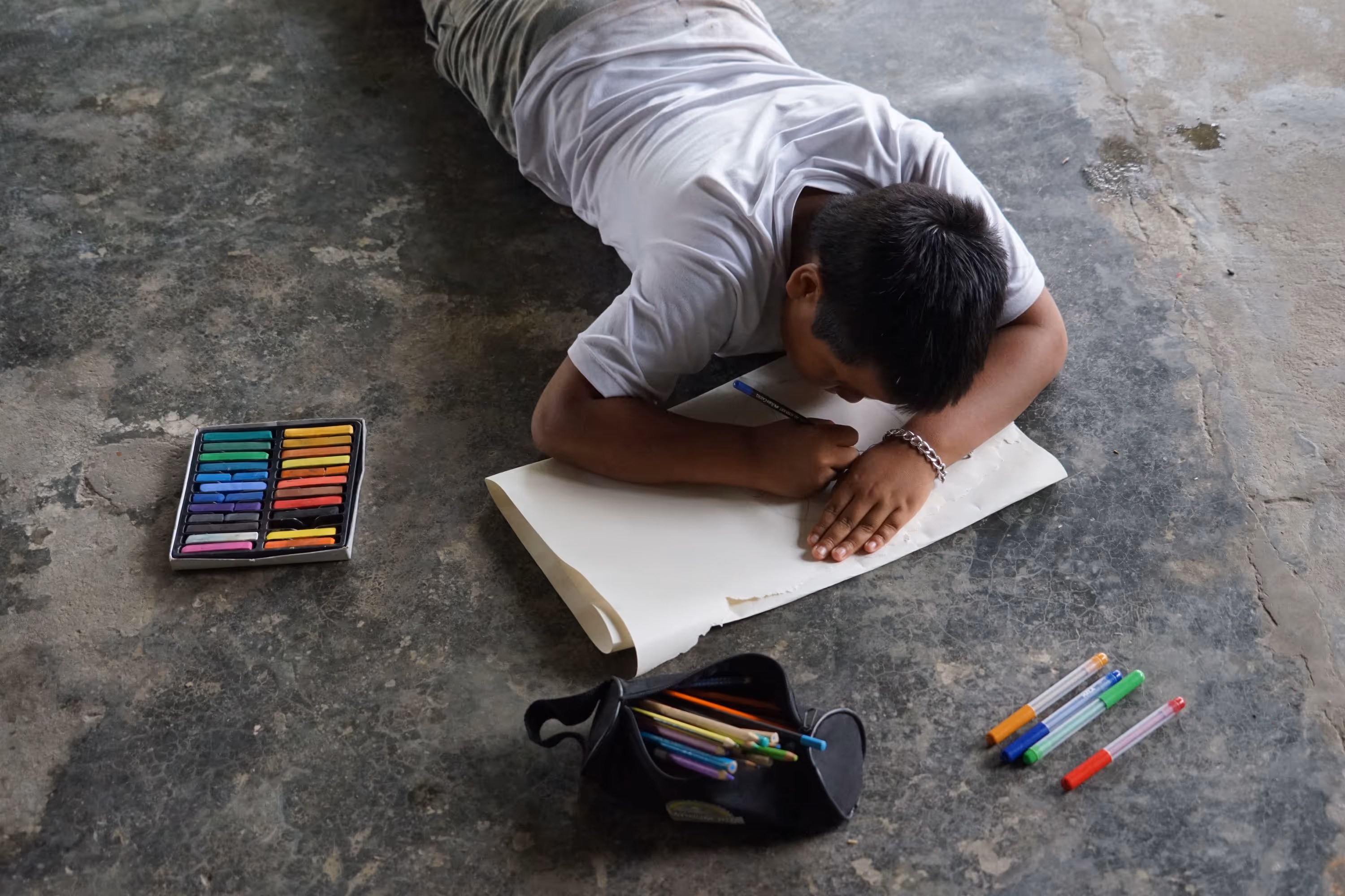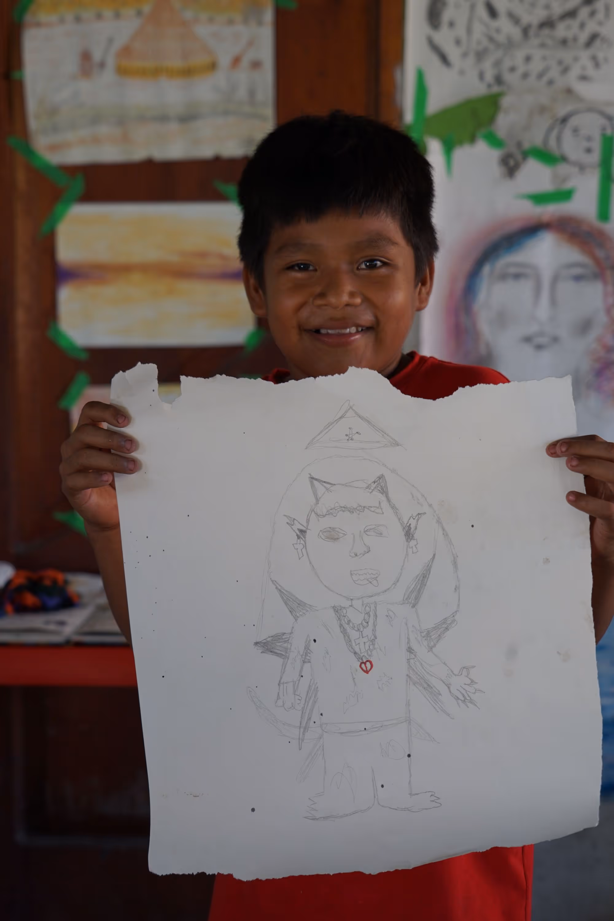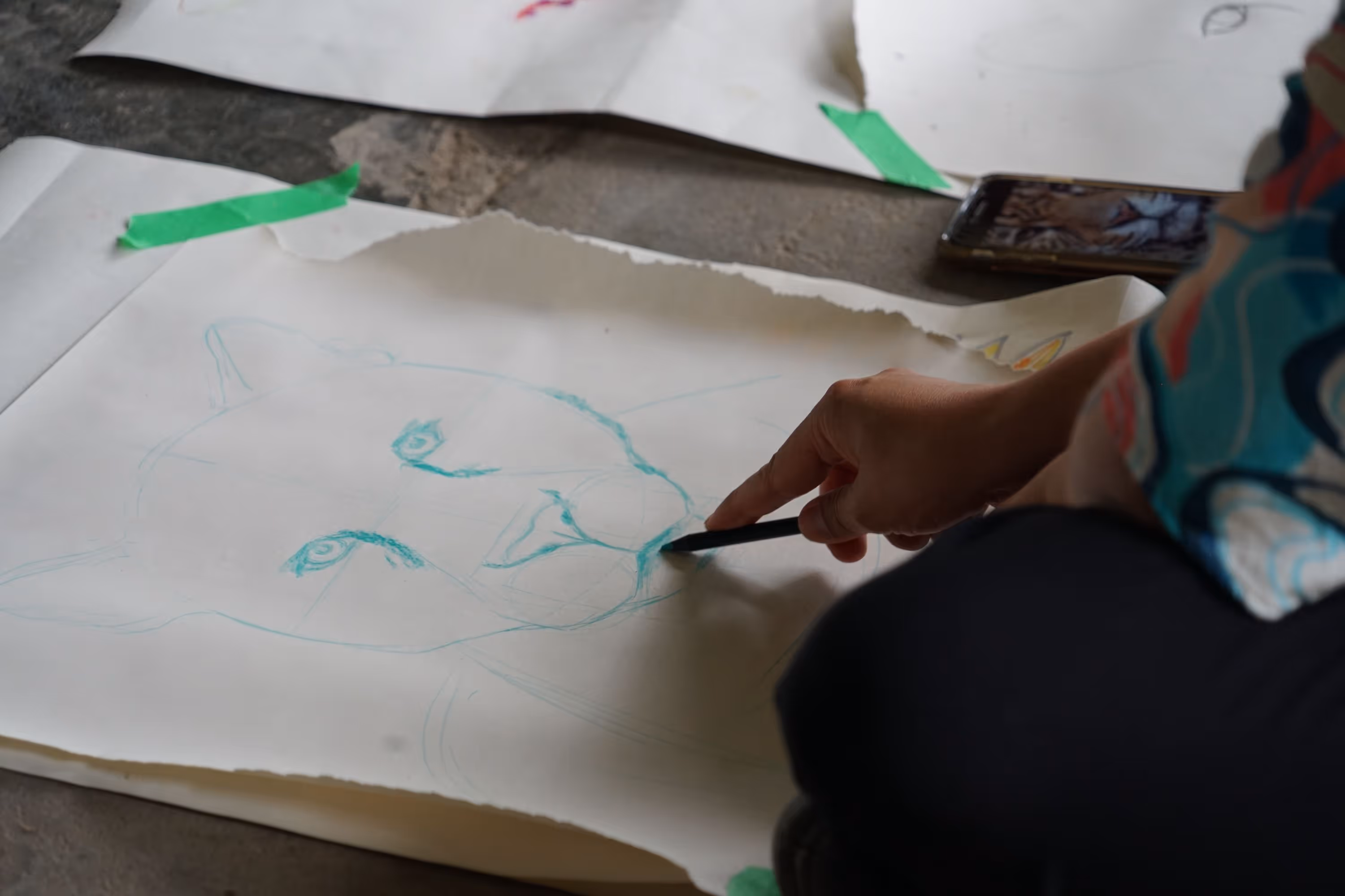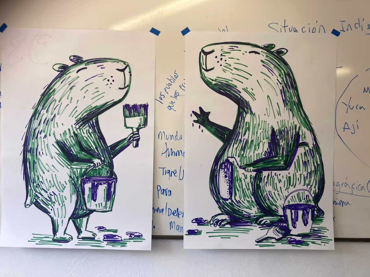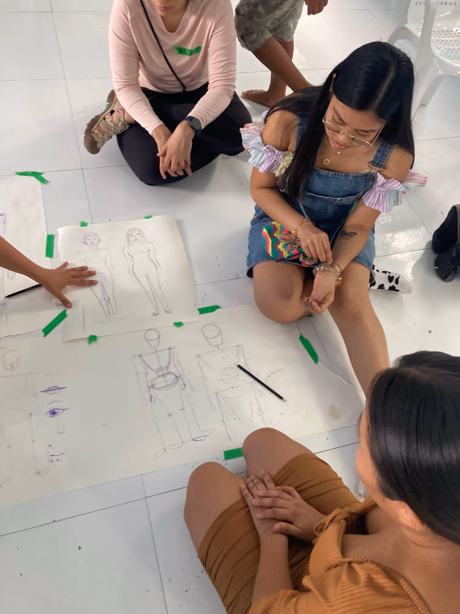 Inicia la bocetación del mural con sesiones de dibujo y planificación colectiva en torno a lo aprendido. Jhonier, artista del Territorio Amazónico, aporta sus bocetos, que dan forma a la estructura general: en el centro las comunidades aisladas y alrededor las cuatro organizaciones que les protegen: AIZA; PANI; AIPEA y CIMTAR.