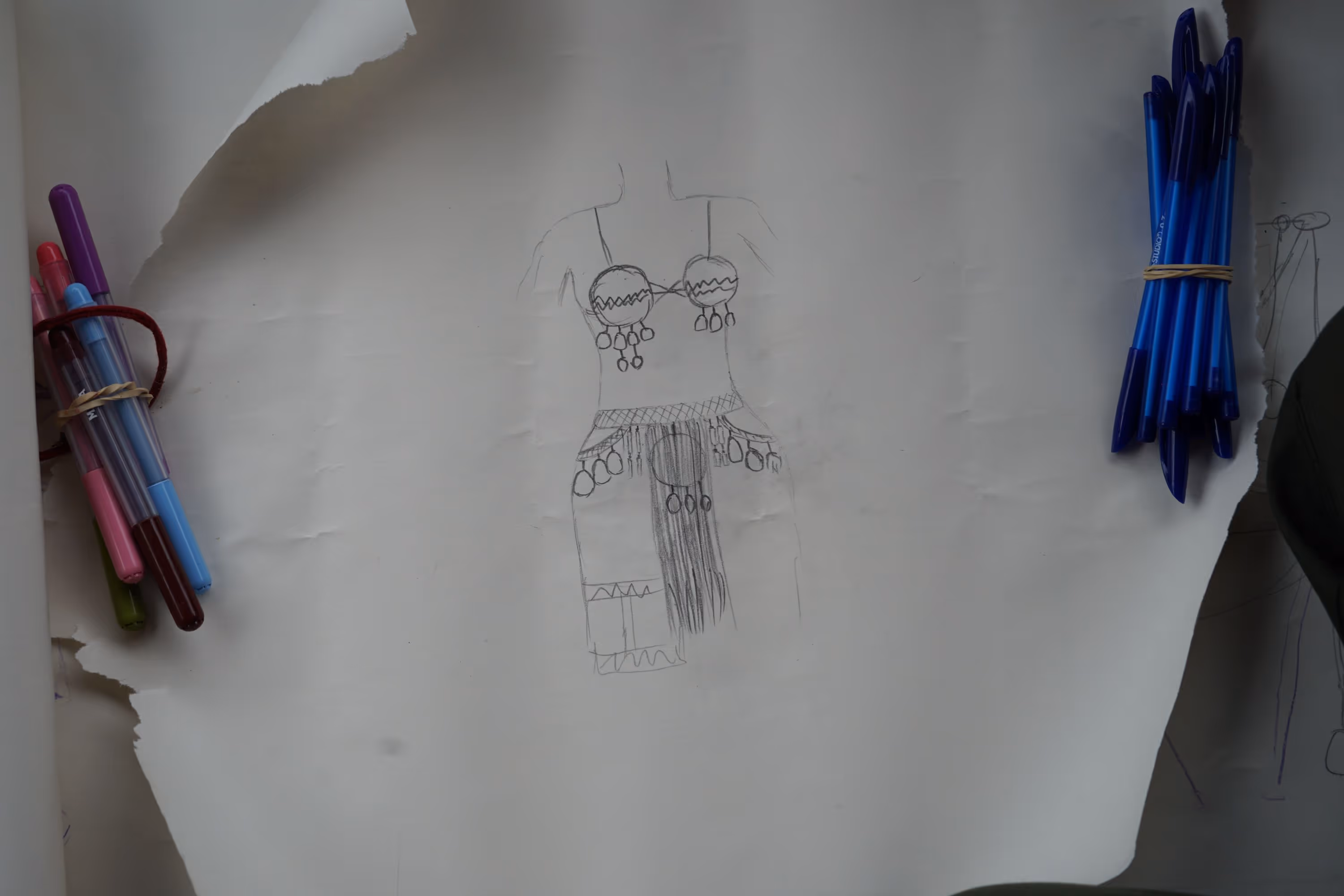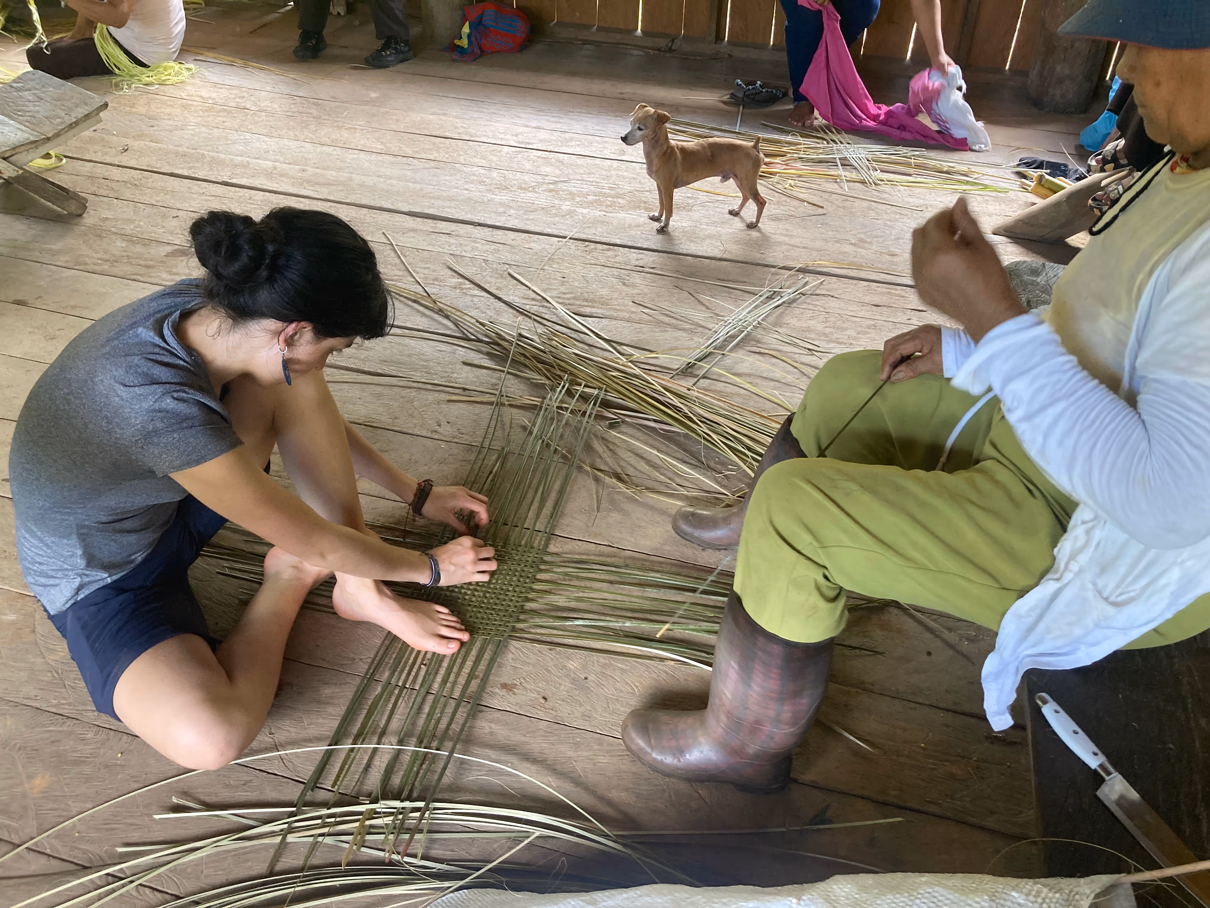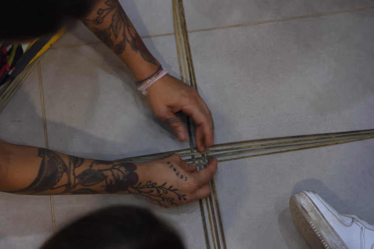 Para este primer acercamiento quisimos crear espacios para compartir saberes con la comunidad, organizamos y ofrecimos dos talleres: uno de audiovisual y uno de dibujo, y facilitamos dos espacios: uno de tejido y otro de tintes naturales, en los cuales fueron los abuelas y abuelos quienes nos enseñaron. Fueron 3 días de taller y un día de socialización de resultados. Luego, algunas personas de la comunidad nos llevaron al resguardo en el Km 23, en casa de Doña Mery y el tío Mañuco donde conocimos más del naane (cuerpo/territorio/tonco) de la gente de agua.