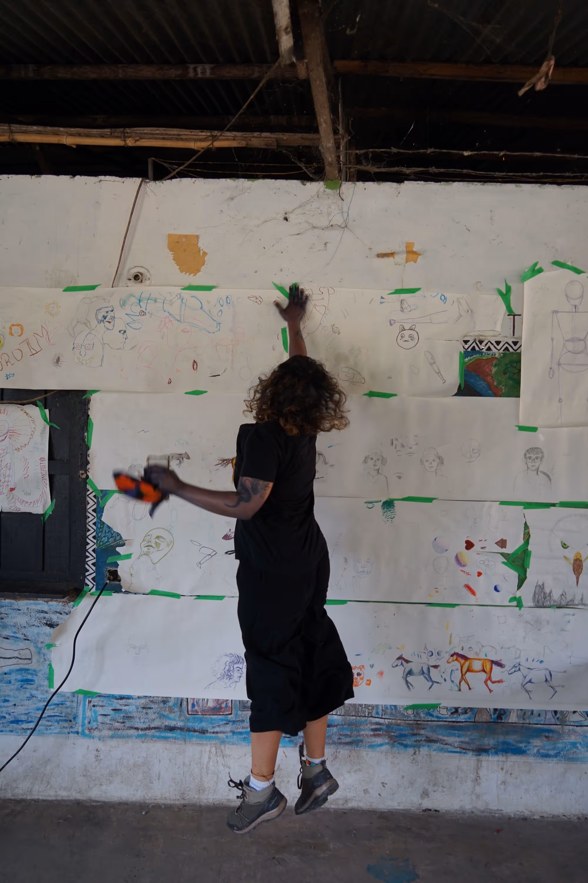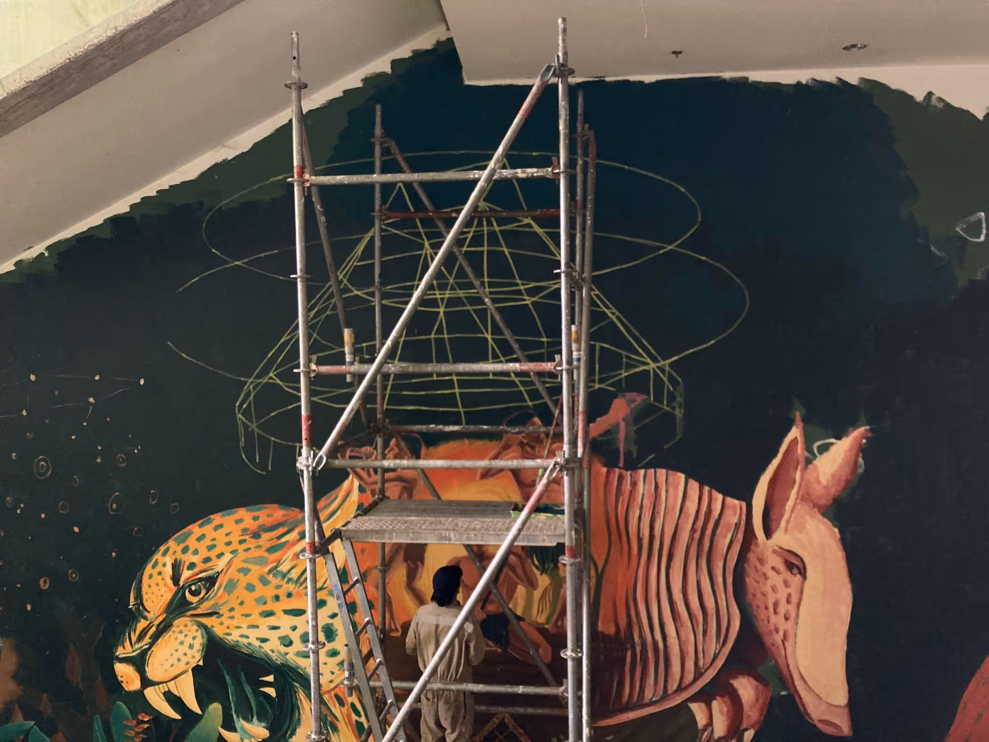 Mediante largas horas de discusión, los símbolos se resignifican, se discuten y se incorporan al mural como parte de un relato compartido. Estos días dibujamos, compartimos estilos y configuramos parte de la estructura principal del mural. hacia el final de este proceso organizamos y compartimos al público interesado una charla con Gabriel Ramírez, antropólogo sobre la situación actual del pueblo embera en en la ruralidad y las ciudades. Todo este proceso se dió como una forma de mirar las convivencias - lo chixi- de las comunidades indígenas con la comunidad académica.