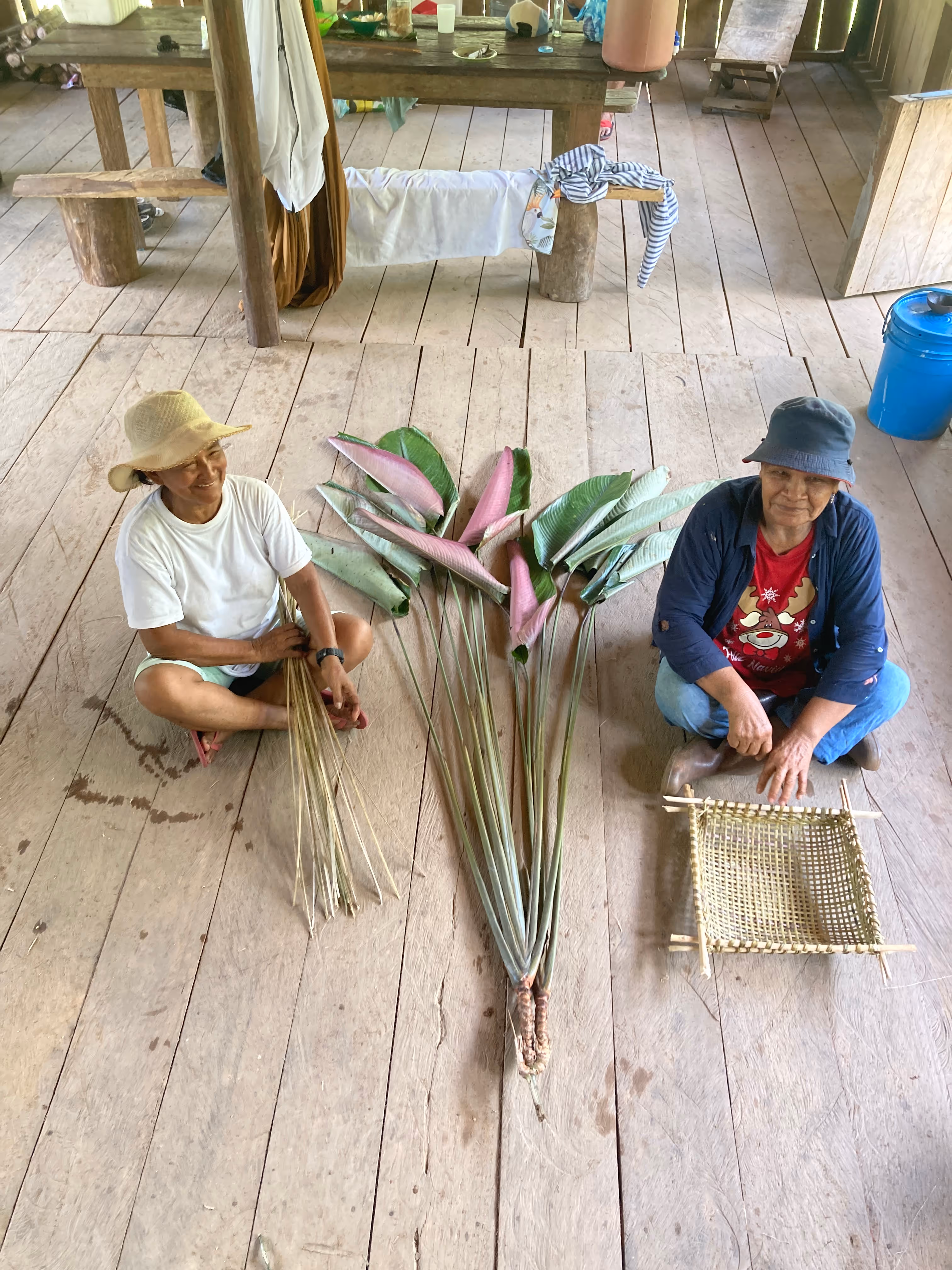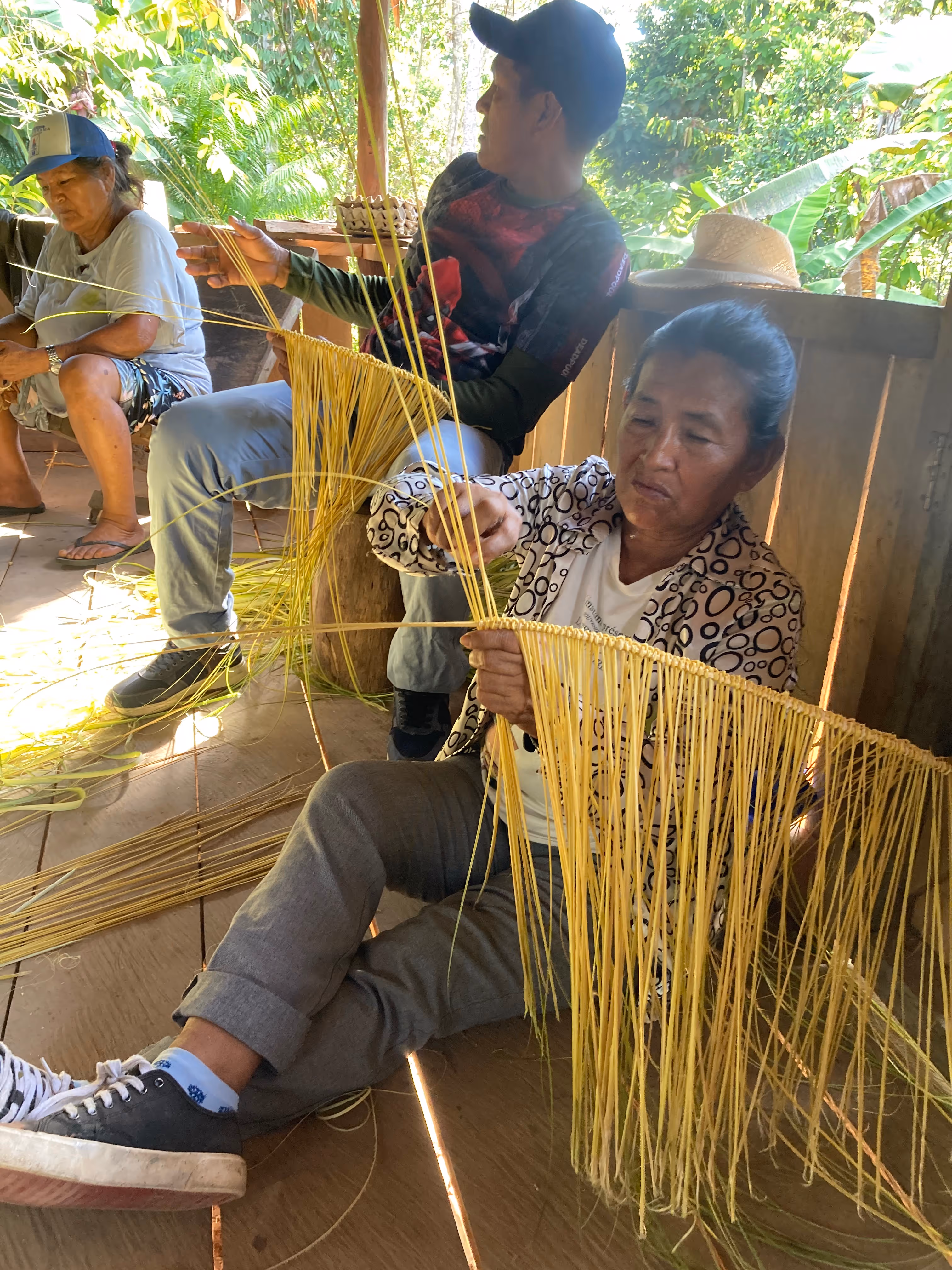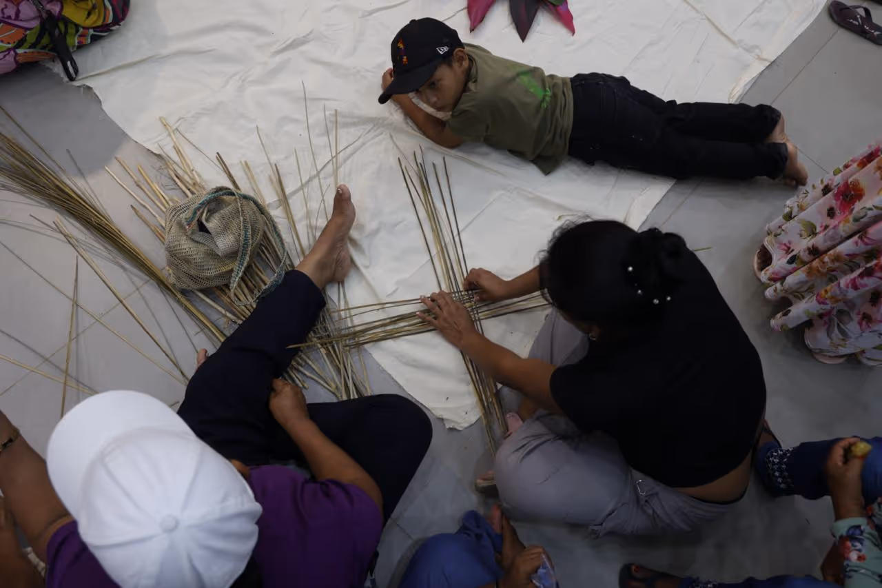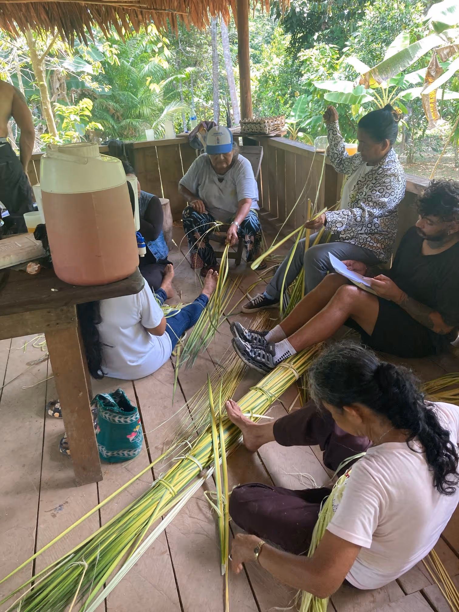 La jornada cerró con el acuerdo de continuar el proceso desde la caminata, la palabra compartida y el respeto por los ritmos del territorio. Regresamos a la casa con depe y chambira, las abuelas empezaron a tejer escobas y cernidores, quienes no sabíamos cómo hacerlo nos acercamos a aprender y si espontáneamente fueron surgiendo ideas y caminos posibles para seguir sembrando bien desde el conocimiento y la práctica del tejido Magüta.
