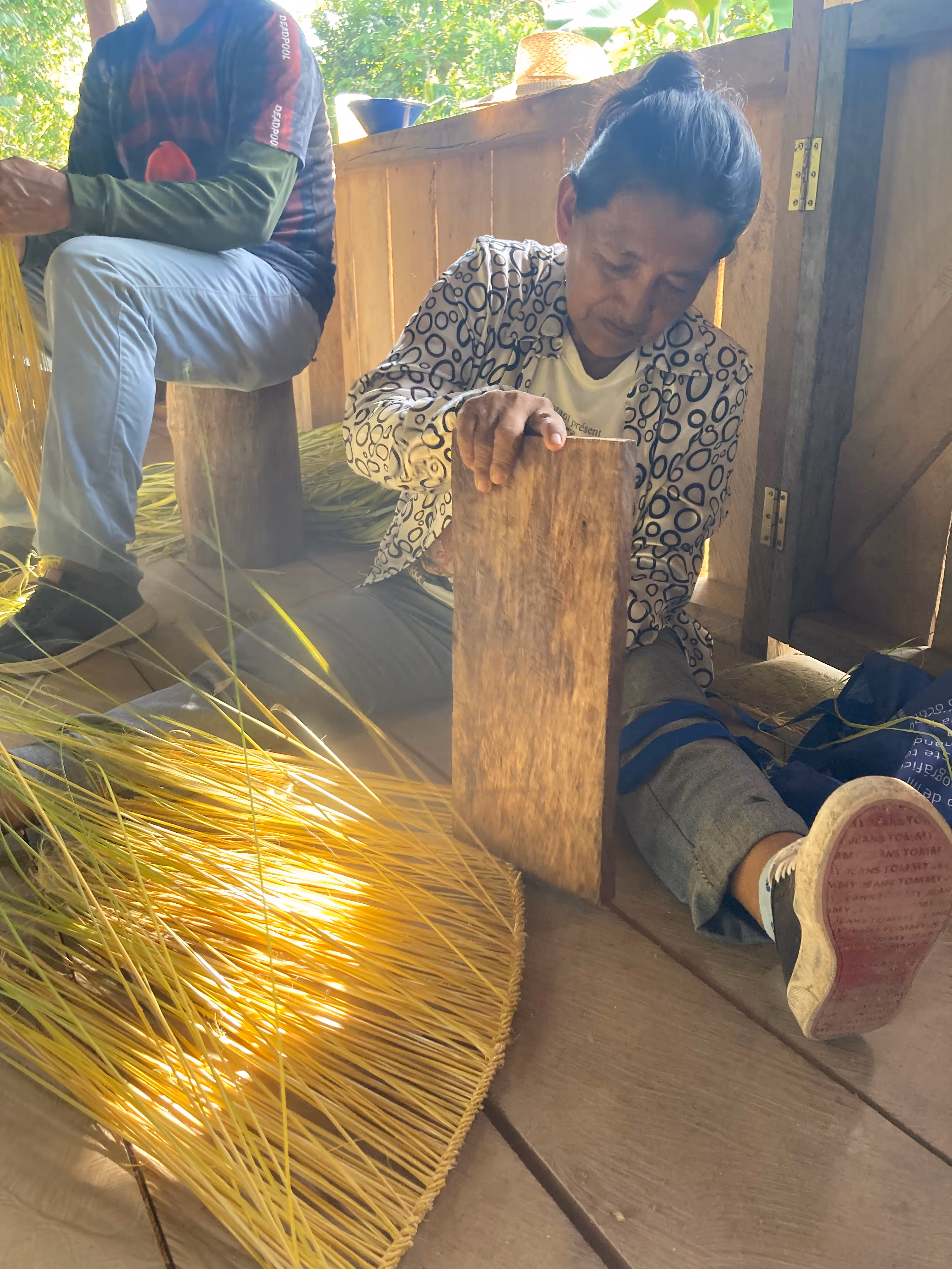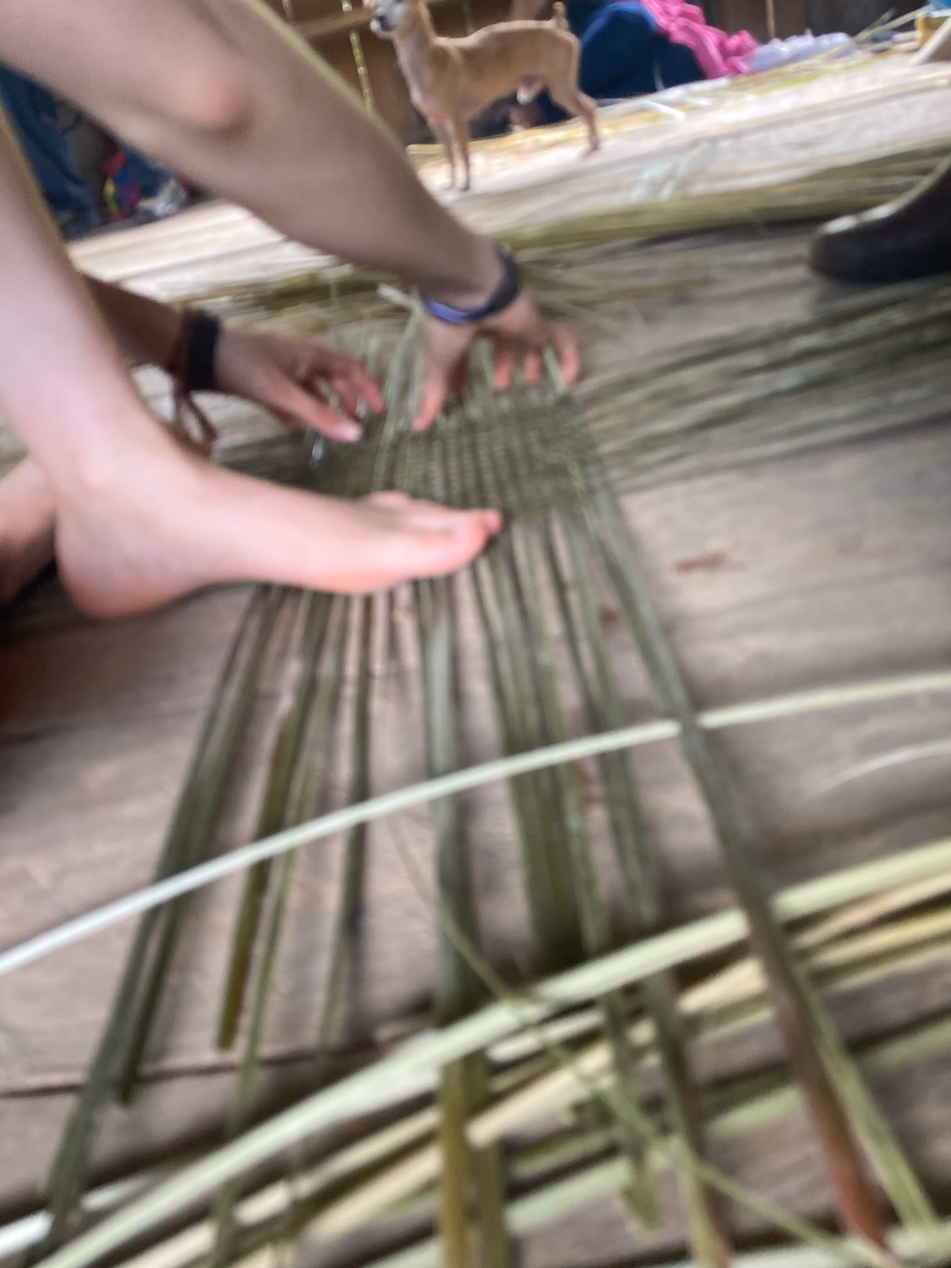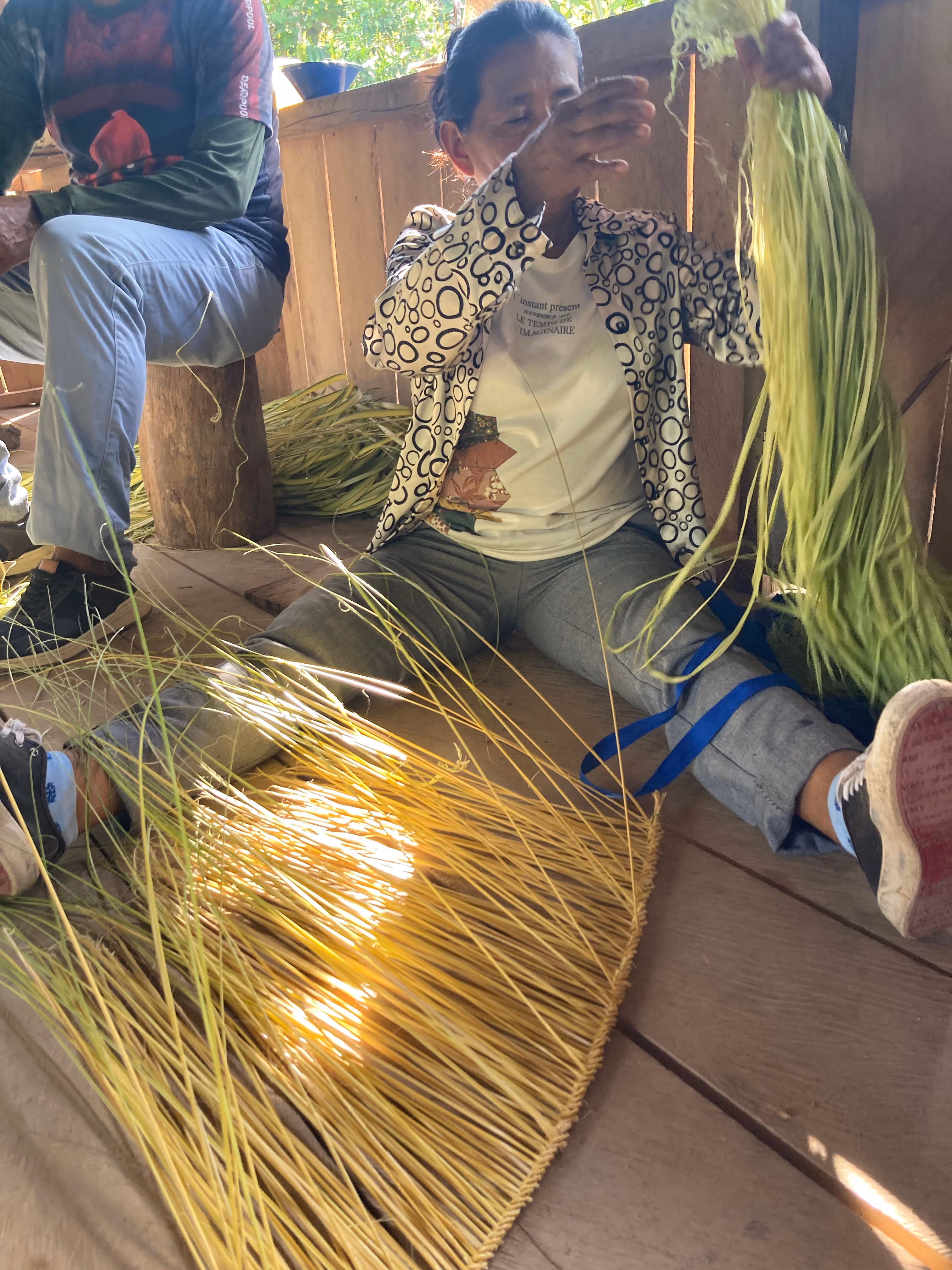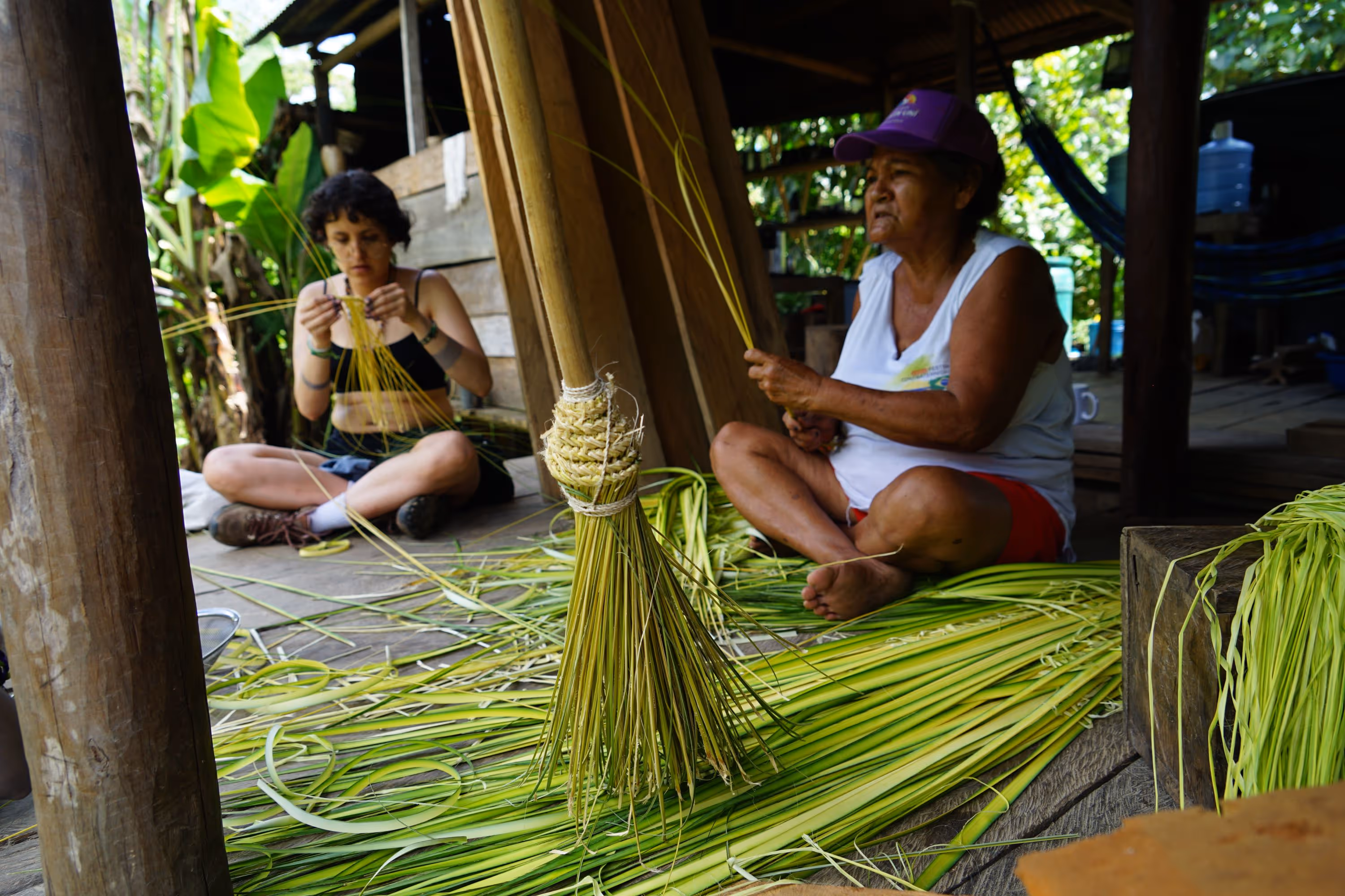 La jornada cerró con el acuerdo de continuar el proceso desde la caminata, la palabra compartida y el respeto por los ritmos del territorio. Regresamos a la casa con depe y chambira, las abuelas empezaron a tejer escobas y cernidores, quienes no sabíamos cómo hacerlo nos acercamos a aprender y si espontáneamente fueron surgiendo ideas y caminos posibles para seguir sembrando bien desde el conocimiento y la práctica del tejido Magüta.