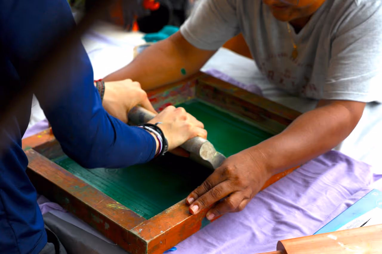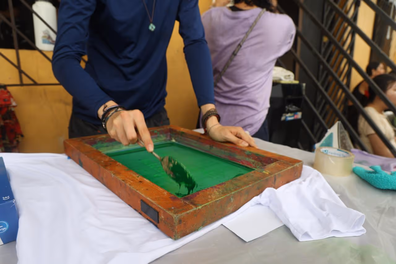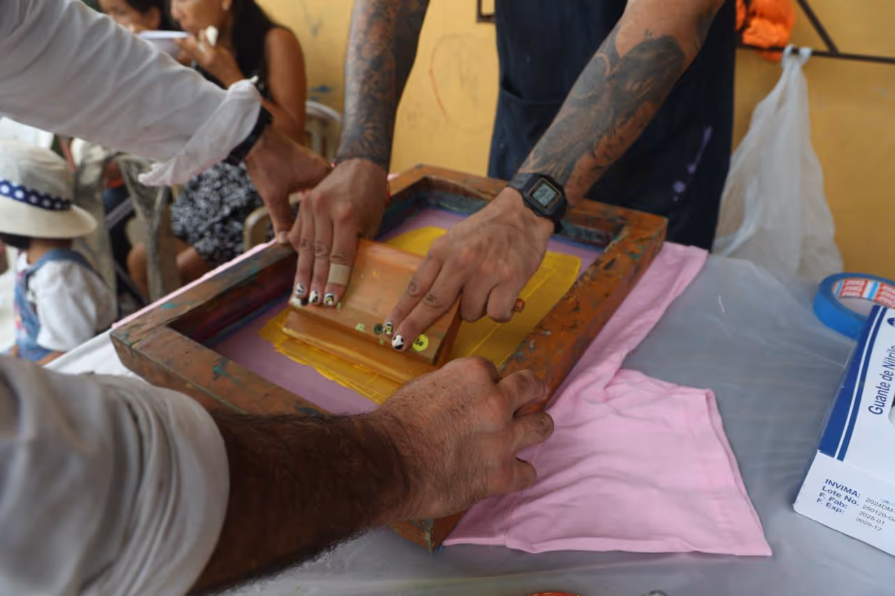 Estampación en serigrafía de camisetas con palabras en lengua Magüta, esto se llevó a cabo en El Castañal, Nazareth y el centro Cultural del Banco de la república.