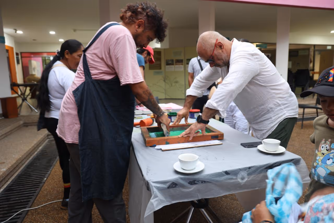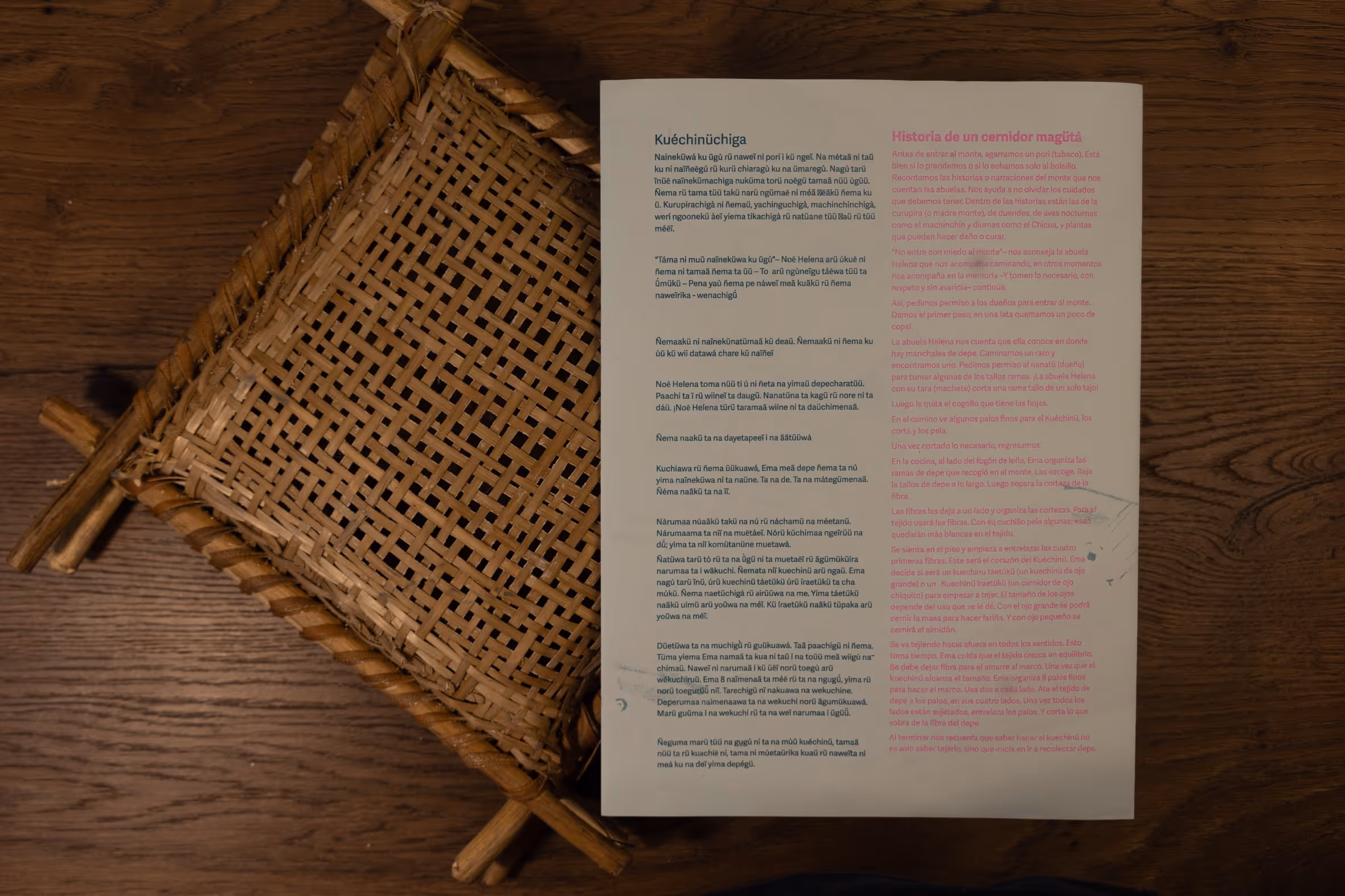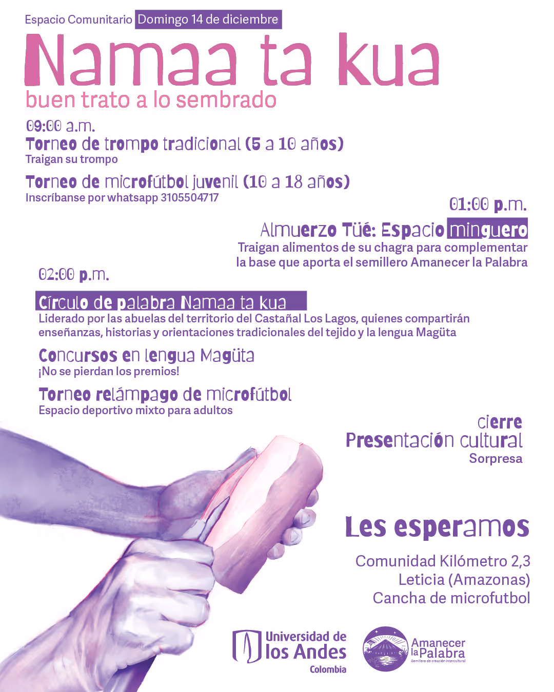 Desde la primera entrada a territorio se empieza a tejer una alianza con el profesor Abel Santos Angarita, de la Universidad Nacional de Colombia, Sede Amazonía quien nos asesora en la publicación de la serie de impresos Magütágüchiga que se centran en el tejido y el territorio para fortalecer la lengua y la cultura en la comunidad. En diciembre del 2025, organizamos un encuentro para hacer entrega del impreso y organizar una serie de eventos de cierre del año. Este encuentro se centró en el tejido y el territorio para fortalecer la lengua y la cultura en la comunidad magüta en Castañal Los lagos (km 2.5 vía Leticia Tarapacá) y en la sede Banco de la República en Leticia.