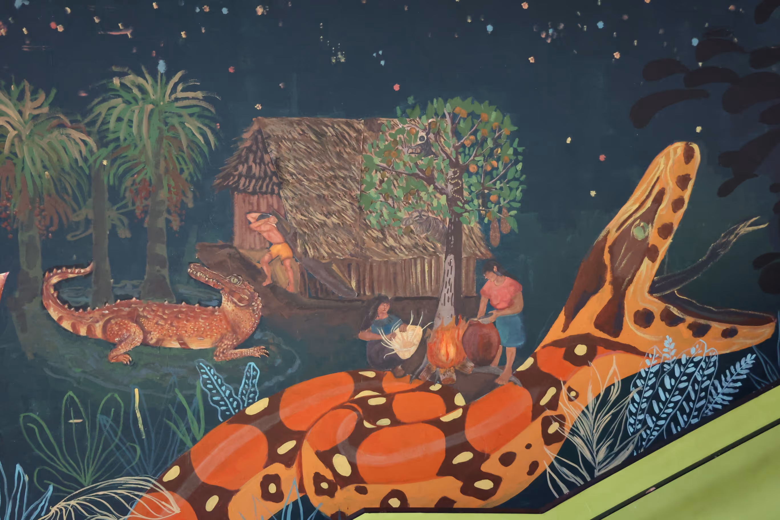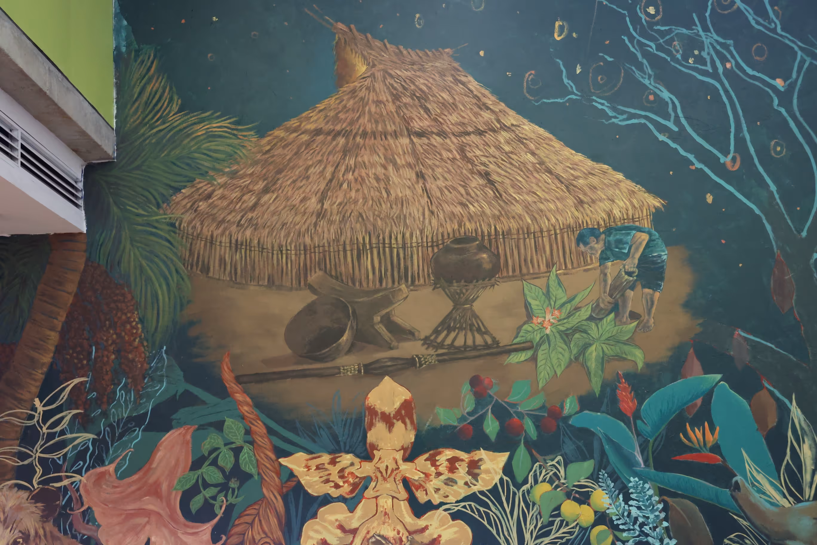 Aun cuando la obra no estaba del todo terminada, se realiza el lanzamiento del mural. El encuentro es un momento para compartir aprendizajes, superar tensiones y afianzar el trabajo colectivo desde el diálogo y la escucha. En la jornada se comparten casabe, chicha y mambe. Pusimos la fogona a hacer casabe para comer con tipití y escuchamos la palabra de quienes habían acompañado el proceso: Jhonyl, Jhonnier, y Jhon Sebastian.