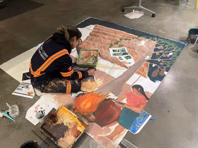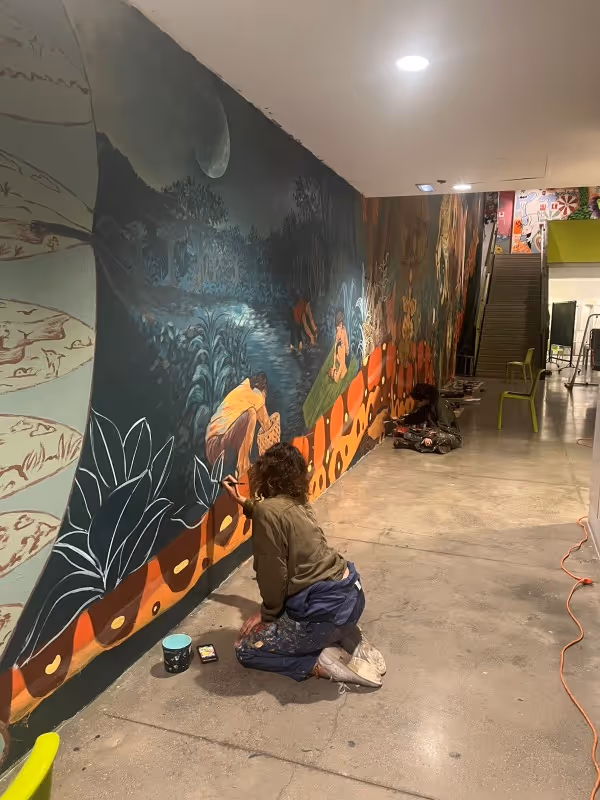 El semillero abre una nueva etapa con la preparación de un viaje al Amazonas, para encontrarse con la comunidad del Castañal. El mural queda en pausa, mientras crece la expectativa por llevar el proceso más allá de la universidad. El viaje al Amazonas afianza profundamente el proceso de creación al entrar en contacto directo con el territorio. La experiencia se construye al hablar, compartir y convivir con la comunidad, reconociendo que las imágenes del mural están inscritas en su vida social y entablando diálogos sobre la cosmovisión magüta y su simbología.